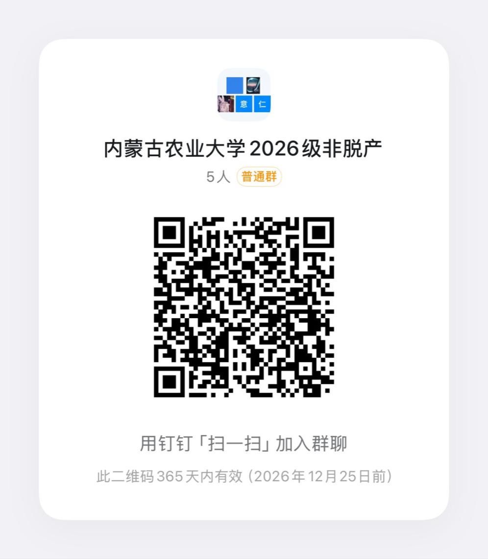 入群方式:使用钉钉扫描下方二维码,或通过搜索群号161135010692申请入群。申请时务必使用本人真实姓名,未使用真实姓名会影响入群验证。后续通知和教学安排会在群内发布,未入群可能会影响查看学校通知。